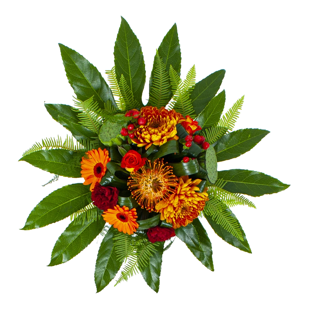 De combinatie van oranje en rode bloemen geven het bladboeket een gezellige en chique uitstaling. Een boeket dat in vrijwel elk interieur past. Bovendien geschikt voor verschillende gelegenheden. Feliciteer, bedankt of verstuur zomaar dit prachtige handgebonden boeket en verras de ontvanger! * Exclusief accessoires en vaas
