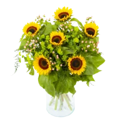De practhige combinatie tussen zonnebloemen en groen geeft boeket zonnestraal een gezellige en zomerse uitstraling. Dit zonnebloemen boeket creëert meteen een prachtige sfeer in huis. Bovendien geschikt voor verschillende gelegenheden. Feliciteer, bedankt of verstuur zomaar dit prachtige handgebonden boeket en verras de ontvanger! * Exclusief accessoires en vaas