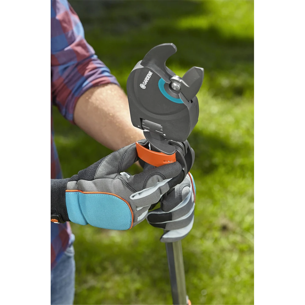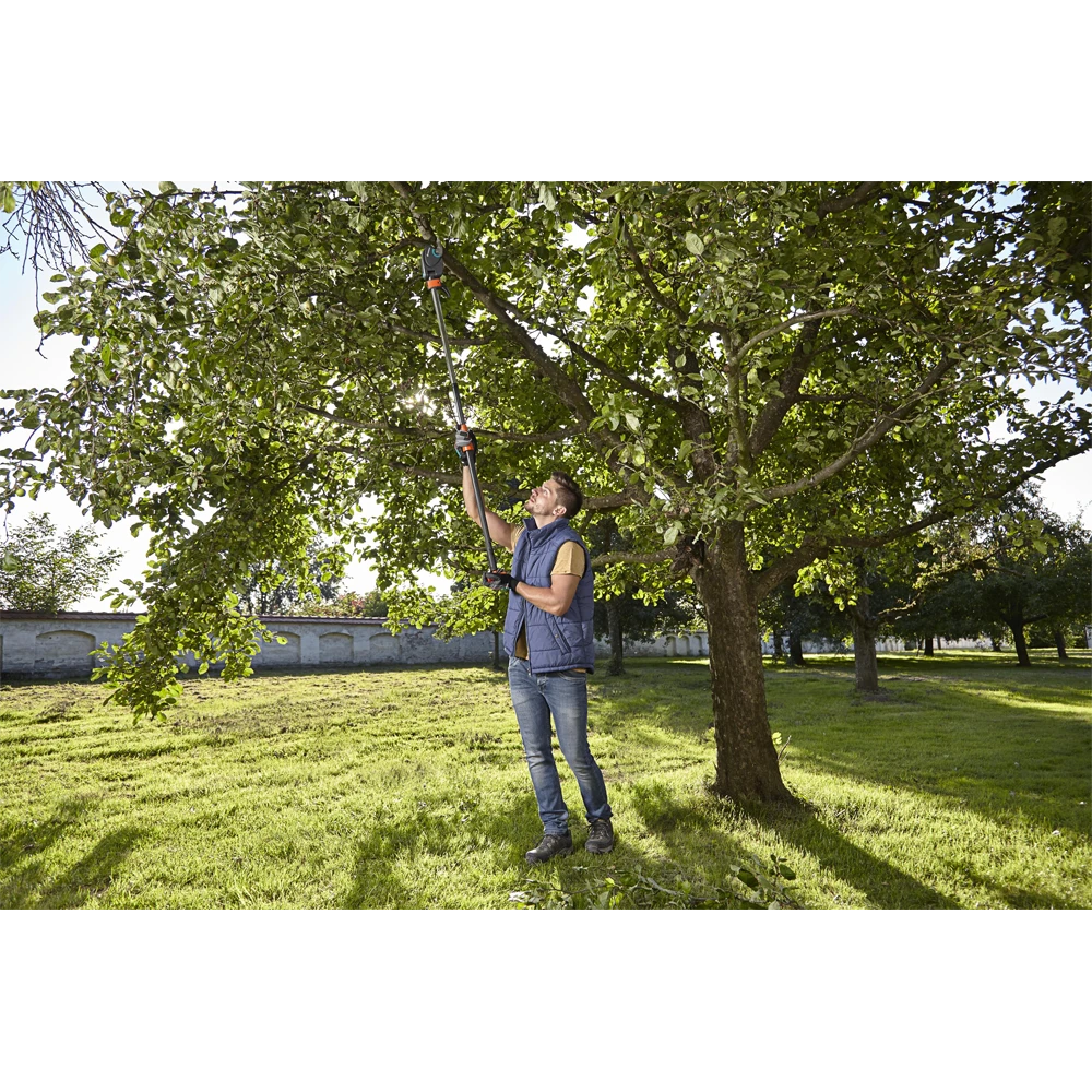 De GARDENA boom- en takkenschaar StarCut 160 plus is de specialist voor boomonderhoud. Met een lengte van 160 cm is eenvoudig en veilig zagen van de grond zonder ladder mogelijk. De 12-voudige transmissie zorgt voor krachtig zagen van takken met een diameter tot 32 mm. De nieuwe, verstelbare haak voor het verwijderen van afgezaagde takken biedt extra comfort. Hiermee kunt u gezaagde takken zonder problemen van de kronen van bomen verwijderen. De GARDENA StarCut 160 plus heeft een intern katroltransmissiemechanisme dat voorkomt dat het tijdens het snoien in takken blijft haken. De extra lichte en slanke snijkop maakt handig en gericht snoeien zelfs bij de stam mogelijk. De snijhoek kan individueel vanaf de grond worden aangepast. De precisiegeslepen, niet-klevende messen verminderen de weerstand bij het zagen en garanderen een eenvoudige reiniging. De trekhuls met slipstop en een extra T-hendel zorgen voor een aangename en veilige bediening en nog meer bereik. Dit bereik bedraagt ​​in totaal ca. 3,5 m inclusief de lengte van de gebruiker. De GARDENA StarCut 160 plus is ‘Made in Germany’.