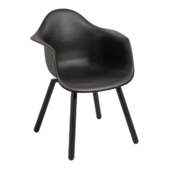Het onderstel van de stoel heeft een zwarte coating, maar is vervaardigd uit aluminium. Hierdoor staat het niet alleen mooi, maar is de stoel ook onderhoudsvriendelijk! Het zitgedeelte is gemaakt van kunststof en bevat gaatjes voor de afvoer van (regen)water. Kunststof is sterk, onderhoudsarm en licht in gewicht. Beide materialen zijn zeer geschikt voor buiten.